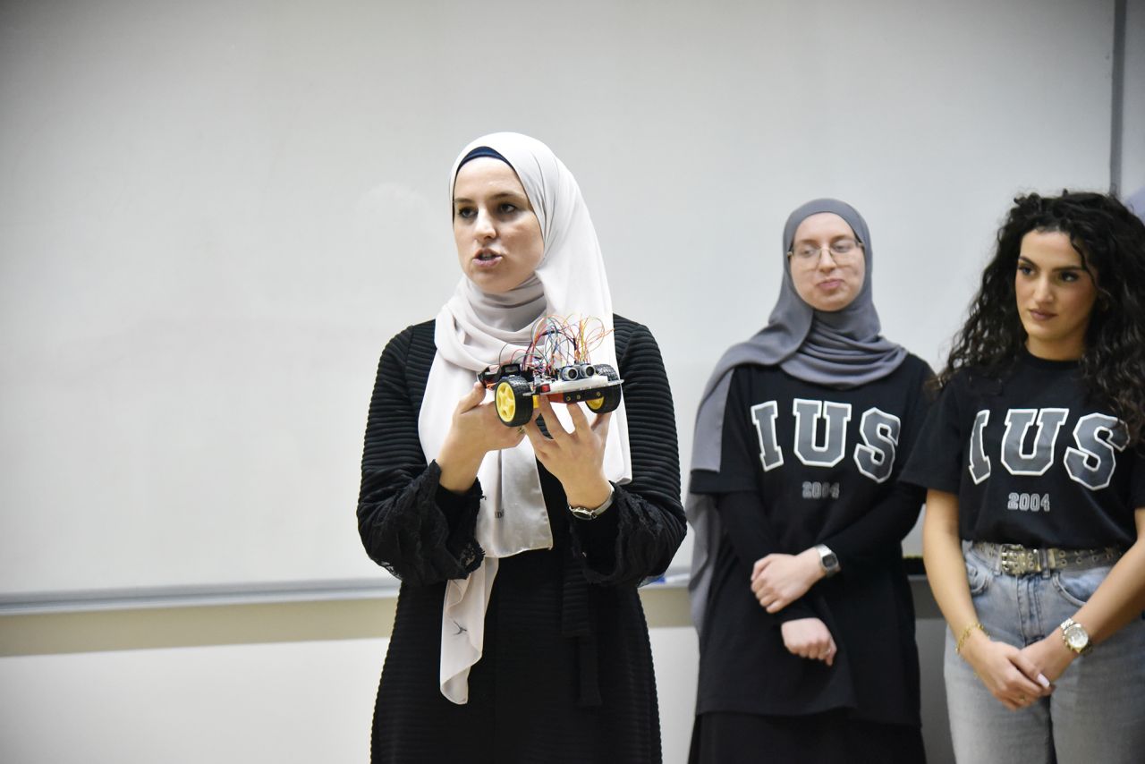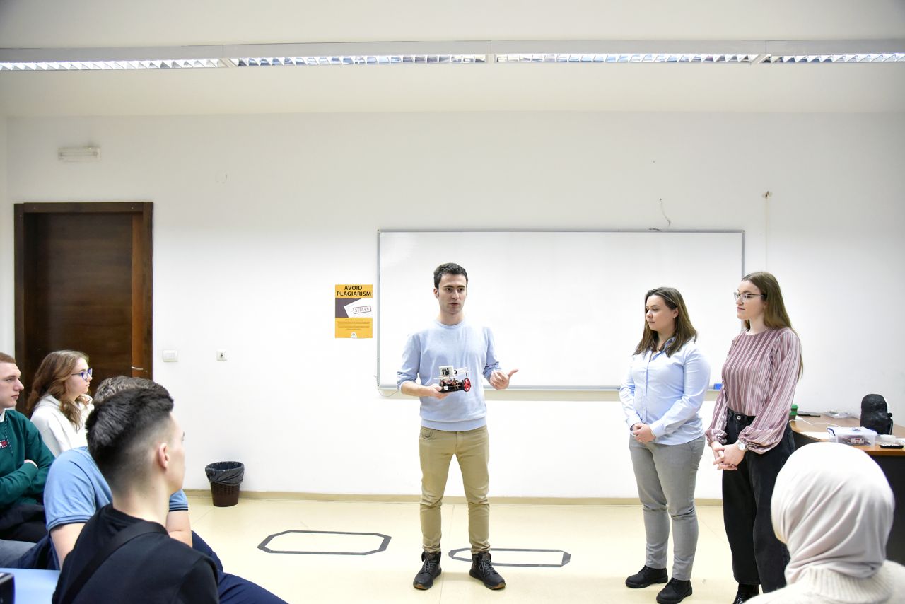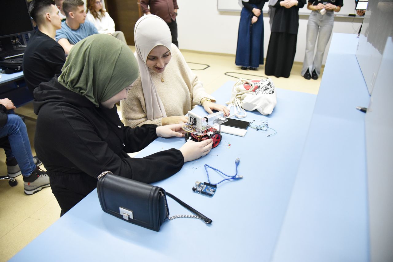 At the very beginning of the event, Assoc. Prof. Dr. Tarik Namas introduced high school students to the EE program, presenting the opportunities they have at IUS. This introductory session aimed to give students insights into the academic aspects, potential internship opportunities, and finally career opportunities after graduation. Following the introduction, IUS robotics students presented their very interesting projects they successfully implemented during their study at the Introduction to Robotics course. Students who participated in this session are Merjem Skula, Ismeta Gafić, Emina Skula, Amra Gušo, Muamer Din Klico, Amila Bašić, and Džejlan Ždralović.